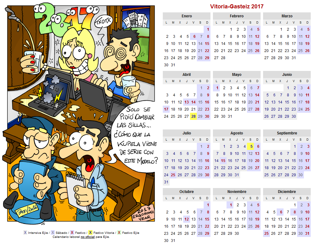 2017: Ergonomic year... y aquí el calendario de 2017 para el que está pensado el dibujo: Para Vitoria-Gasteiz, marcado con los festivos y jornadas intensivas correspondientes al calendario laboral de Ejie. Referencias: La ruta de la sidra (Turismo Euskadi) Sidra de Euskadi. Espuma del Cantábrico (Guía Repsol)